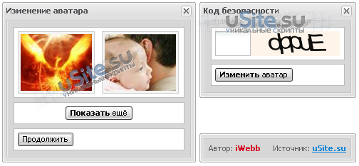 Начнем с того, что данный скрипт редактирует аватар не заходя на страницу ред. данных, как вы наверное уже заметили на скриншоте редактирование происходит в uWnd окошке, есть поддержка кода безопасности. Внедрена функция «Подгрузки материалов», по нажатию на эту кнопку, как вы уже поняли — происходит подгрузка последующих фотографий. По нажатию на фотографию — она выделяется, что бы было видно, какую выбрали. Данный скрипт был написан по просьбе одного из пользователей сайта uSite, а именно Deerty. 1. В конец вашего CSS, вставляем: